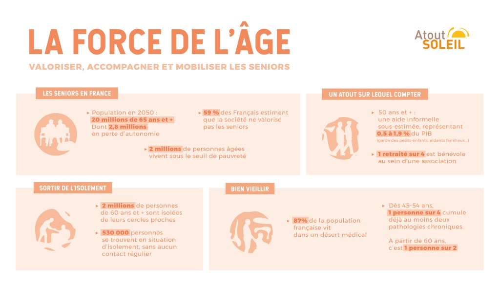 Le fonds de dotation Nos Épaules et Vos Ailes, GPMA, l’assureur Generali et La Médicale lancent un nouvel appel à projets dans le cadre de l’opération de mécénat Atout Soleil. Cette 19ème édition, intitulée « la force de l’âge : valoriser, accompagner et mobiliser les seniors » vise à soutenir les associations françaises qui portent des projets innovants permettant notamment de :